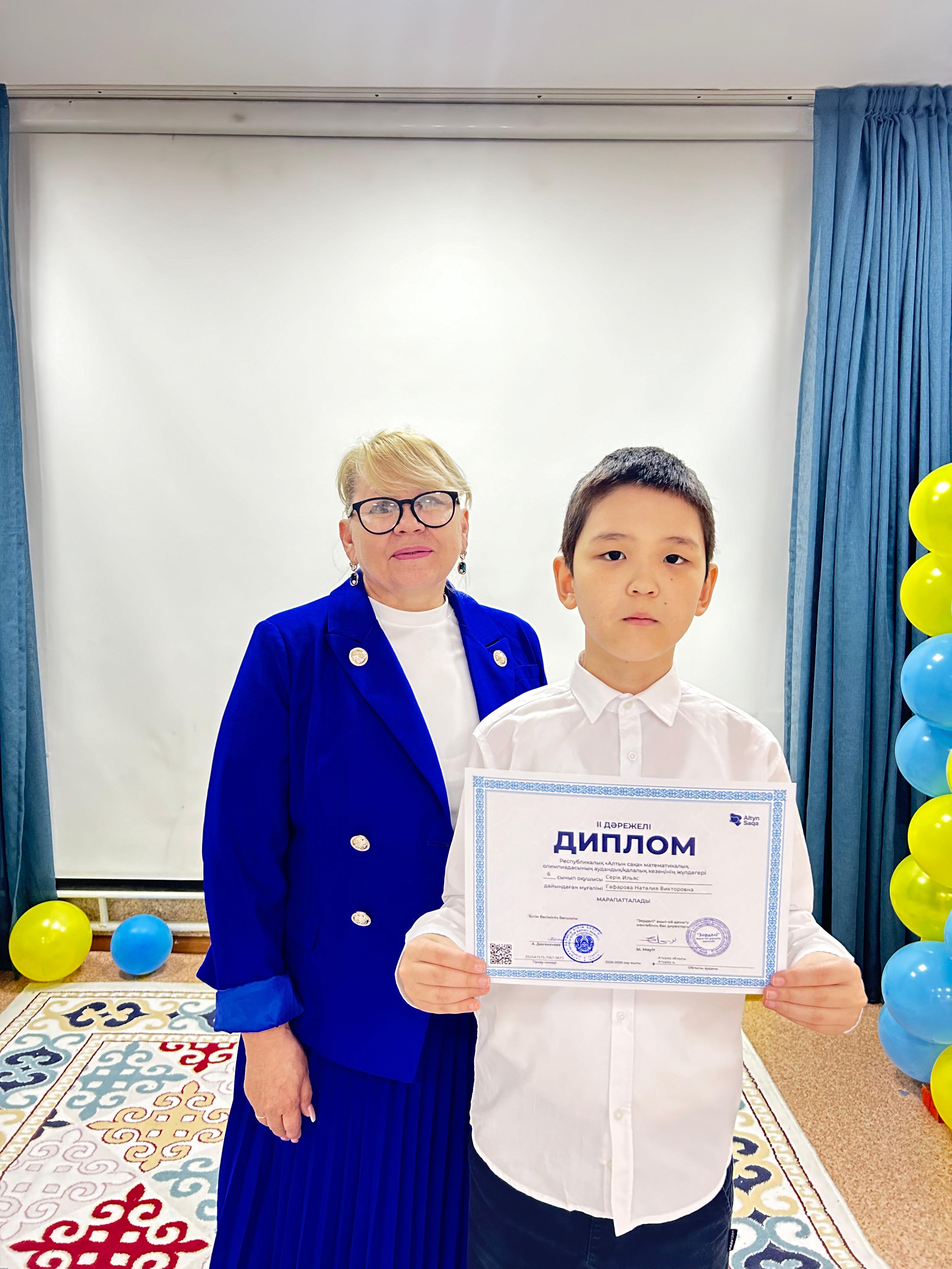 Республикалық «Алтын сақа» математикалық олимпиадасының қалалық кезеңінің ІІ орын иегері 6 сынып оқушысы Серік Ильяс