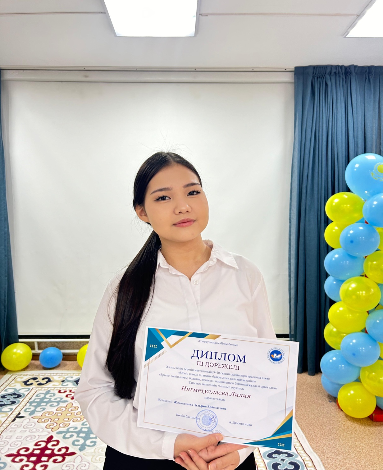 Жалпы білім беретін мектептердің 9-10 сынып оқушылары арасындағы өткен «Менің шағын Отаным» байқауының қалалық кезеңінде «Ертеңгі менің өлкем: болашақ жобасы» номинациясы бойынша жүлделі ІІІ орын алған 9 сынып оқушысы