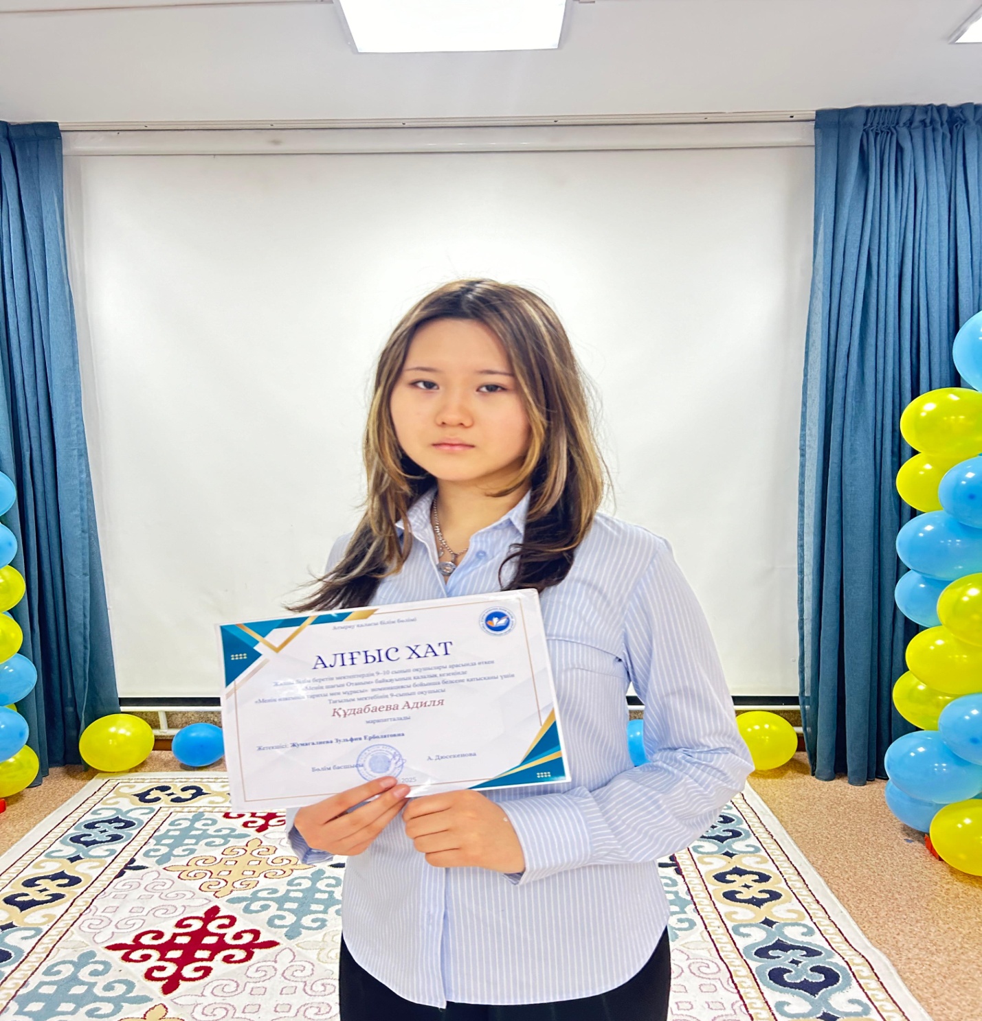 Жалпы білім беретін мектептердің 9-10 сынып оқушылары арасындағы өткен «Менің шағын Отаным» байқауының қалалық кезеңінде «Ертеңгі менің өлкем: болашақ жобасы» номинациясы бойынша «Алғыс хатқа» ие болған 9 сынып оқушысы